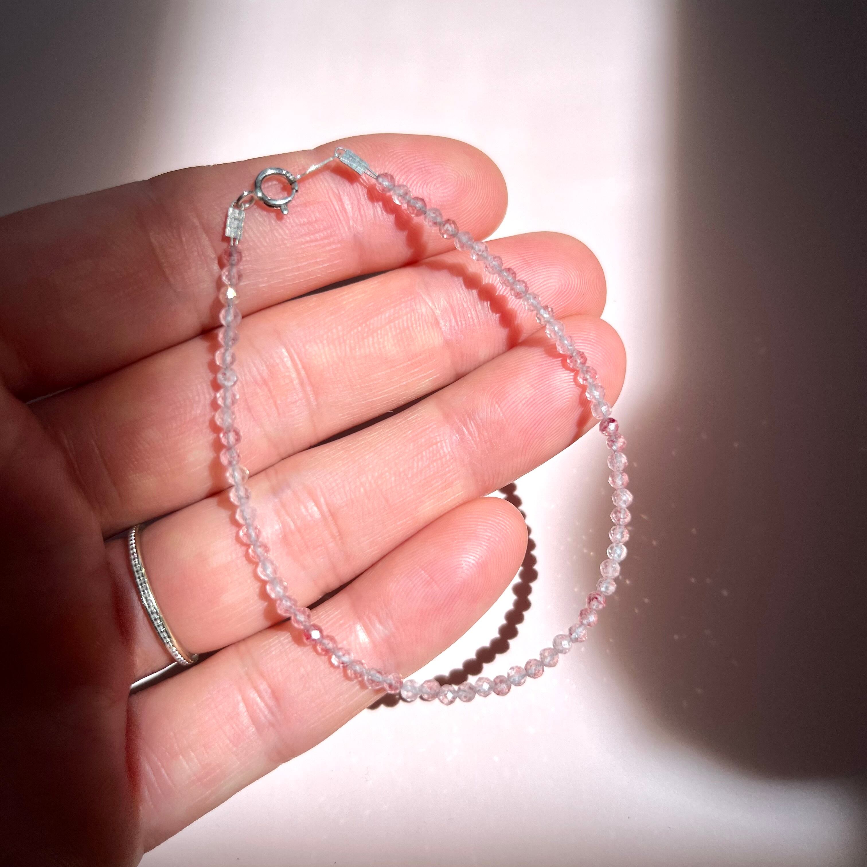 キラキラと輝くシンプルなハンドメイドのチェリークォーツブレスレットが登場です。深いピンクから淡いピンクのやさしく美しいコントラストが、見る人の心を惹きつけます。毎日のコーディネートに華やかさを加え、貴女の手元を優しく彩ります。